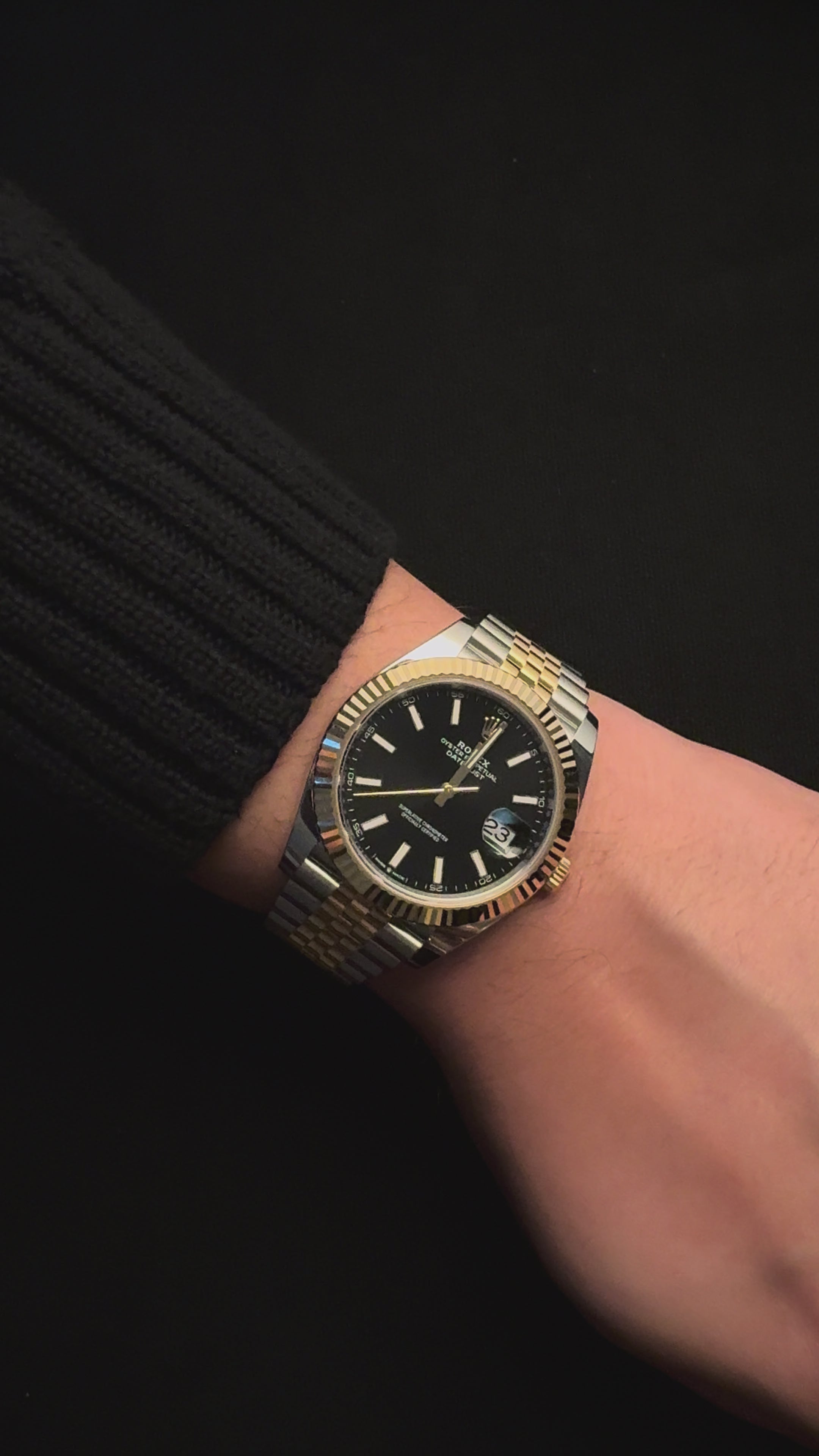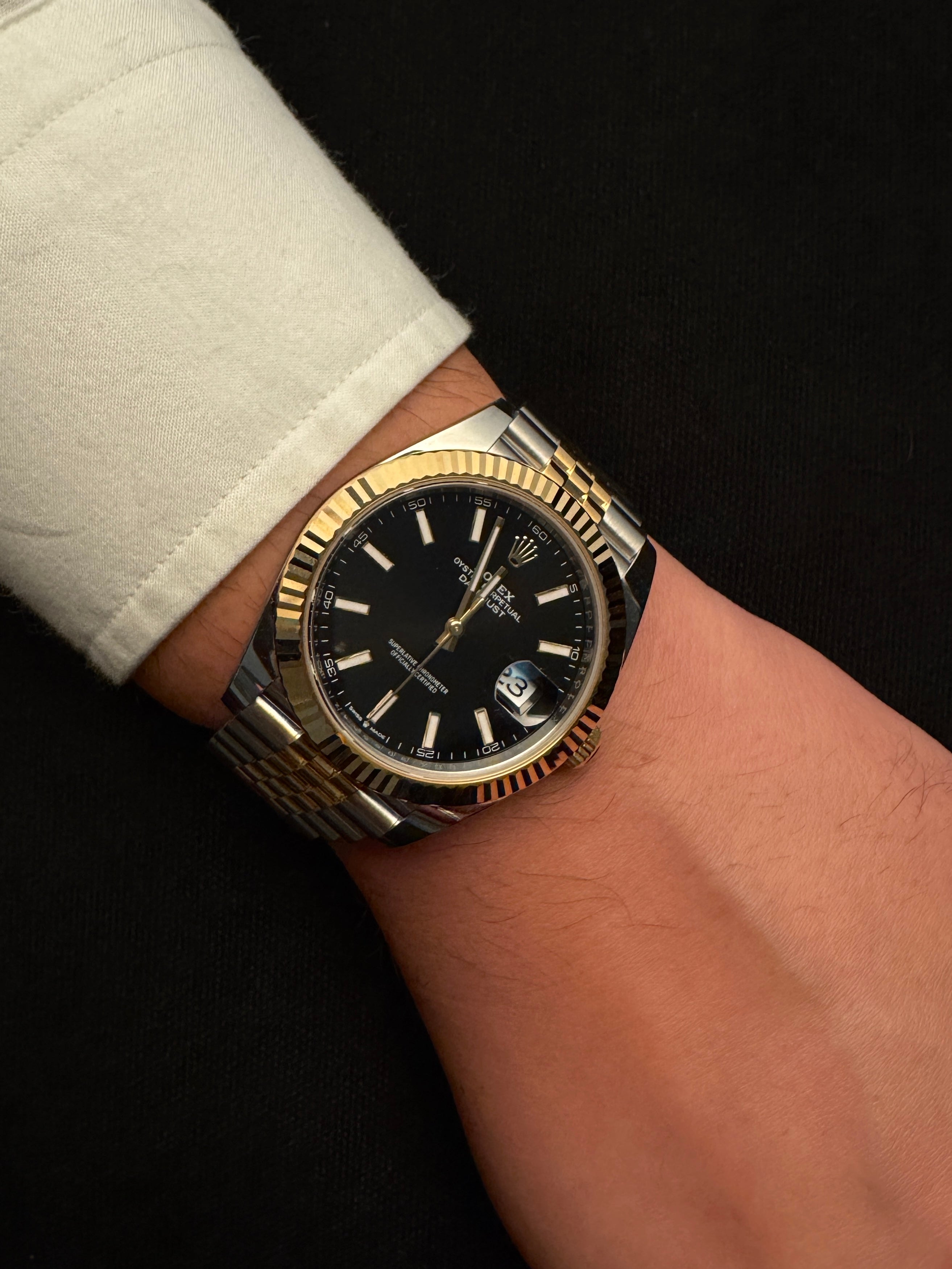 Fluted bezel ve Jubilee bilezik kombinasyonu modelin en saf Rolex kimliğini yansıtırken, siyah sunburst kadran bu örneğe güçlü, modern ve zamansız bir duruş kazandırır.